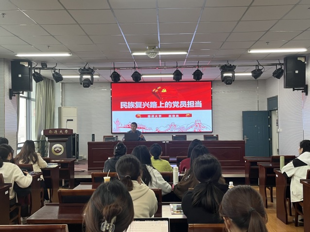 学院团委书记、本科生第二党支部书记赵敬龙老师作题为《民族复兴路上的党员担当》专题报告。他从百年来的伟大精神、党取得的四个伟大成就、新时代党员的伟大担当这三个层面,介绍了中国共产党在领导国家实现民族复兴的实践中付出的巨大努力和牺牲,展现了共产党人不忘初心、牢记使命的担当精神。启迪新时代党员同学要继承和发扬先辈的优良传统,树牢共产主义理想信念,在基层实践中发光发热,用脚丈量祖国的大地山川,将青春挥洒在每一片热土,在实现民族复兴的伟大征程上建功立业。